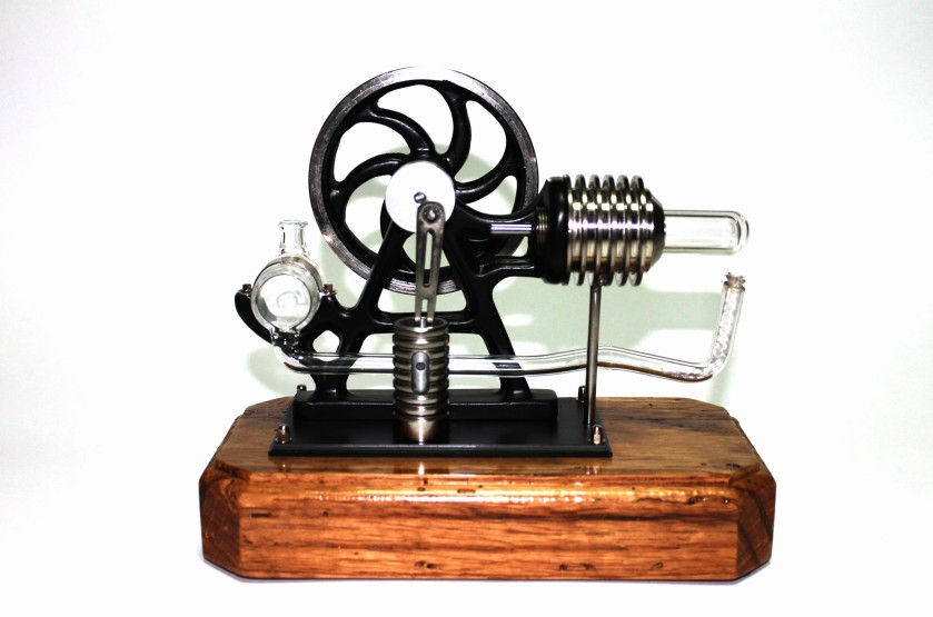 Motore Stirling ad aria calda di progettazione NG Models, tipo “Ringbom”, caratterizzato dall’assenza delle bielle che muovono il pistone di dislocamento, che viene quindi azionato pneumaticamente.